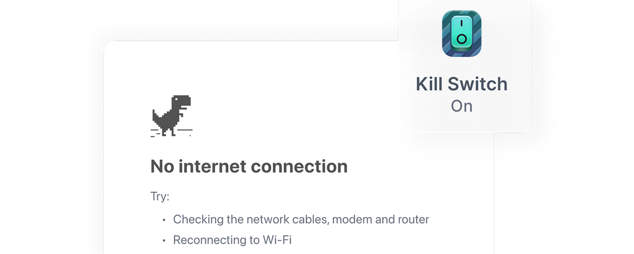 当社のキルスイッチはVPNの接続が解除されると、インターネット接続を無効にします。 常時接続VPNは自動で当社サーバーへの接続を再確立します。 Proton VPNのこれらの機能は、接続が中断されてもデータの安全性を確実に保ちます。