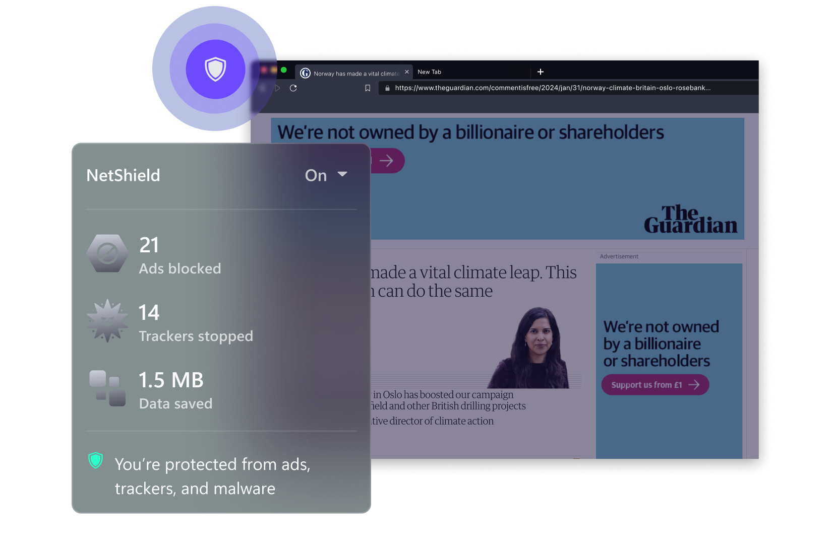 NetShield広告ブロッカーが広告、トラッカー、悪意あるスクリプトを阻止し、当社のDNSフィルタリング機能が不適切なドメインへの接続を防ぎます。
