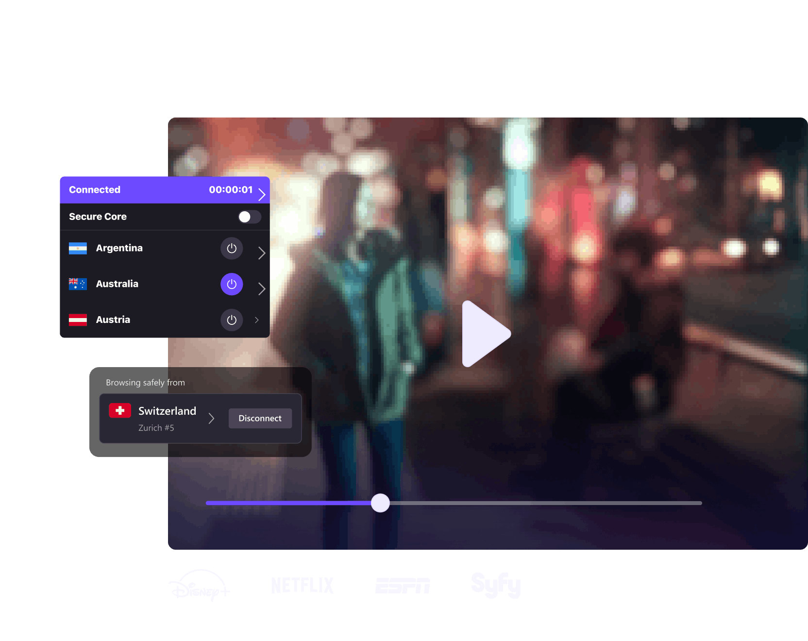 Подключитесь к серверам Proton VPN, чтобы получить доступ к контенту и веб-сайтам, закрытым вашим местным интернет-провайдером.