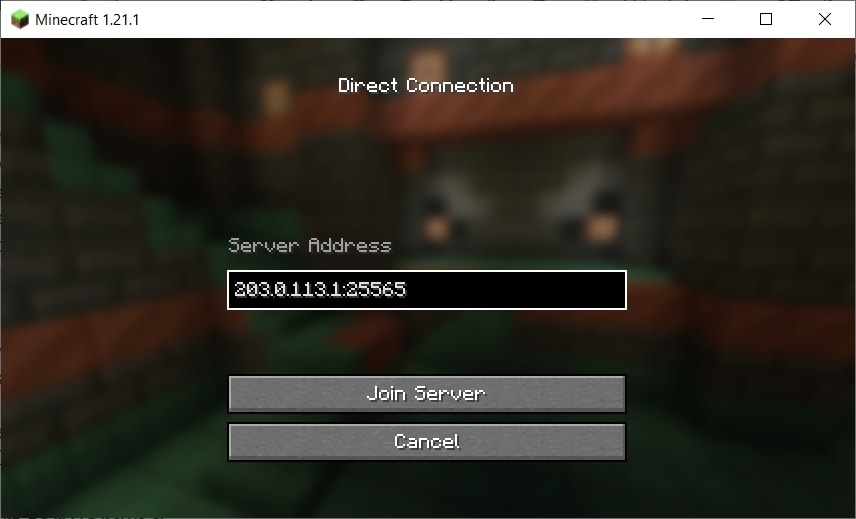 Your friends can now connect to your game by entering your public IP address and port. For example, for public IP 203.0.113.1 and port 25565, they can use 203.0.113.1:25565.