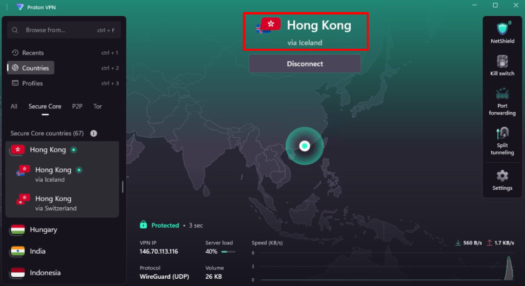Once the connection is established, the Secure Core routing details will be clearly displayed on the Home screen.