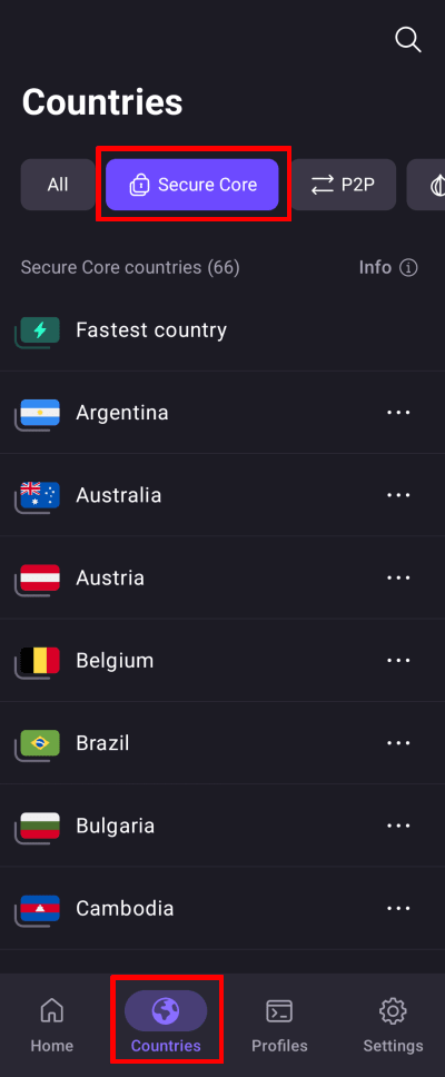 1. Open the Proton VPN app and go to Countries tab →Secure Core filter tab to see the list of countries that support Secure Core.