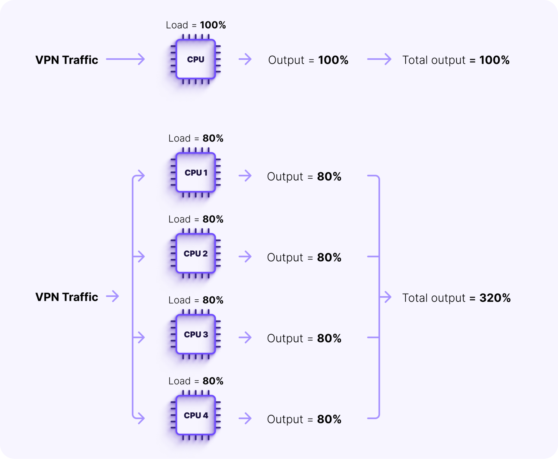 Proton VPN переработал OpenVPN, чтобы правильно распределить нагрузку на процессор между несколькими процессами. Это значительно снижает вероятность перегрузки одного потока. Мы применяем схожие методы для всех протоколов VPN, которые мы поддерживаем.