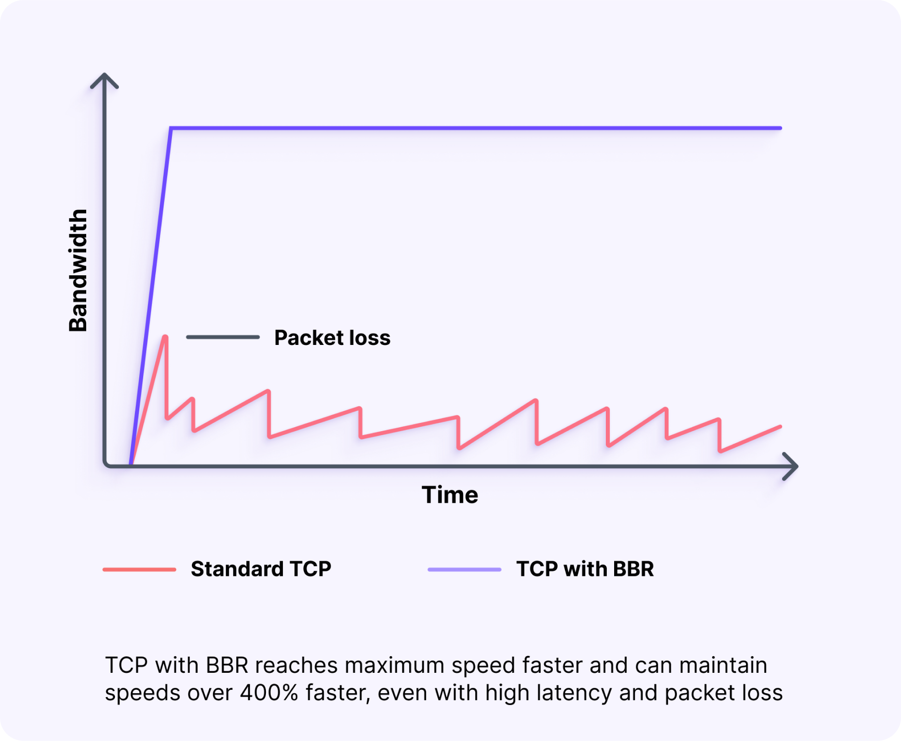 VPN Accelerator разделяет путь между сервером VPN и пунктом назначения на более короткие пути. Это обеспечивает более высокую совокупную производительность на всём пути. Он также использует усовершенствованный алгоритм управления потоком TCP в сети под названием BBR(новое окно) для уменьшения задержки и обхода перегрузок в Интернете.